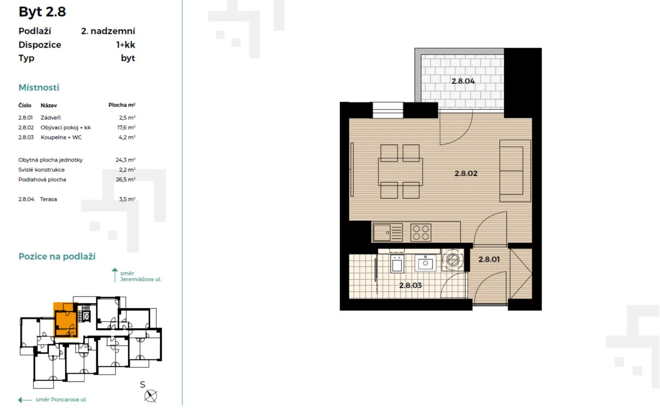 Situován je na severovýchodní stranu, 1. patro (2.NP) s výtahem. Hlavní obytný prostor je vybavený kuchyňskou linkou se spotřebiči (el. varná deska a elektrická trouba, myčka, chladnička a mikrovlnná trouba). Dále úložným prostorem v podobě skříní, a menším dvojlůžkem. V předsíní najdeme další, tentokrát vestavěné skříně a z předsíně můžeme vstoupit do koupelny osazené sprchovým koutem, umyvadlem a toaletou. Je zde i pračka, která je stejně jako ostatní vybavení součástí nabídky.